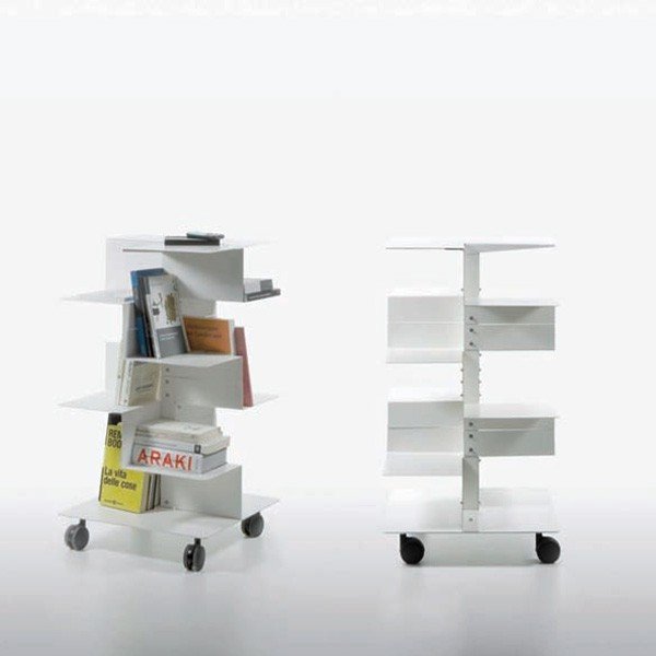 Librespiral di Danese è una libreria mobile costituita da pochi e semplici elementi modulari. La sequenza apparentemente irregolare delle mensole e la diversità dei quattro lati contribuiscono a dare movimento alla forma. Un impercettibile gioco di inclinazioni permette ai libri di restare in posizione anche quando la libreria viene ruotata.
