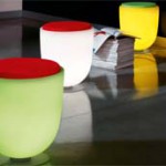 Pouf luminoso per esterni, ma che si può anche usare in casa, Campanone di Modoluce, è disponibile anche nel modello ricaricabile, con alimentatore o ad energia solare e fornito di ciambella di galleggiamento per l’utilizzo in piscina. Design Paolo Grasselli.
