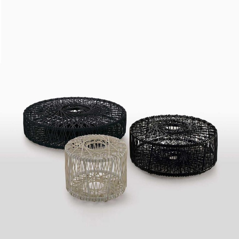 Pouf Outdoor. Corde in fibra naturale avvolte come un gomitolo su una struttura di alluminio. Un pouf per esterni dalla geometria complessa, ma dall’aspetto giocoso che può essere un piano d’appoggio o una seduta. Reel di B&B Italia.