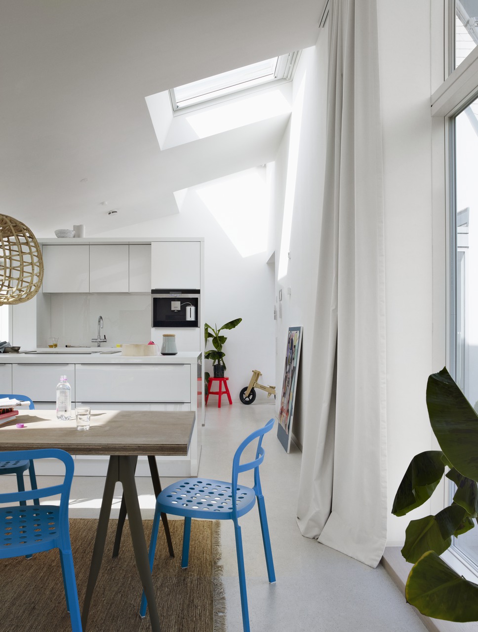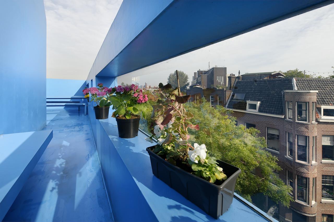 Il terrazzo dipinto di azzurro si fonde con il cielo, così rendere meno evidente la struttura aggiunta sul tetto. Inoltre si abbina alle piante verdi e crea un zona dove rilassarsi all’aperto.