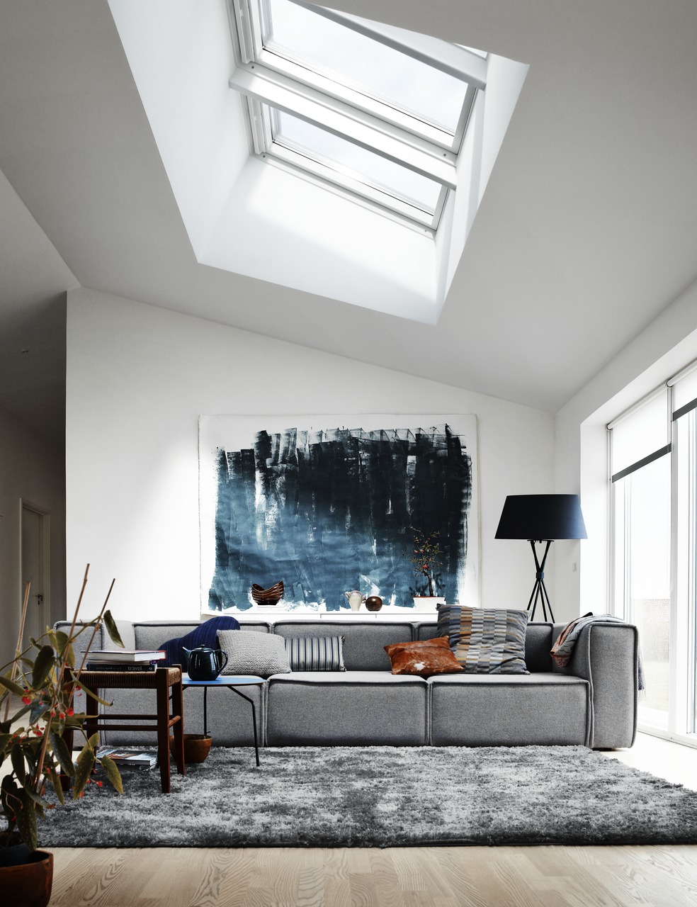 In questo salotto il blu è abbinato al grigio e al bianco delle pareti. La tonalità scura ha un effetto rilassante: il quadro astratto sembra replicare l’azzurro del cielo che si vede dalla finestra per tetti. Alcuni tocchi arancio e marrone danno un sensazione di calore.