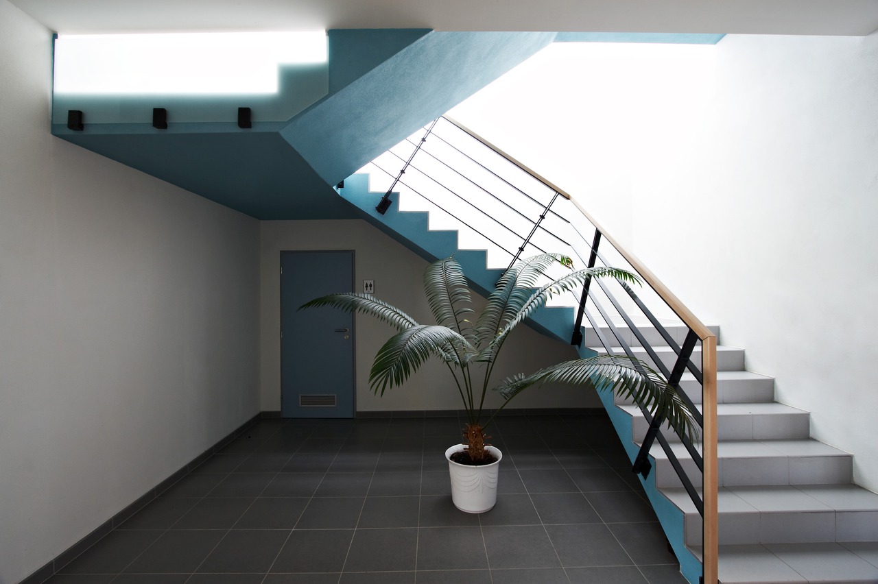 Il profilo delle scale ha un’insolita tonalità di blu, che da personalità a uno spazio altrimenti anonimo.