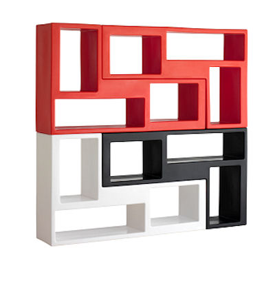 Obo di Cerruti Baleri. Si basa sulla ripetizione di un contenitore modulare realizzato in materiale plastico lucido. Le varie combinazioni creano un sistema di contenimento di oggetti e separazione di spazi da adattare a ogni stanza, In bianco o nero per uno stile più sobrio, o arancio e verde lime se volete creare una zona vitaminica.
