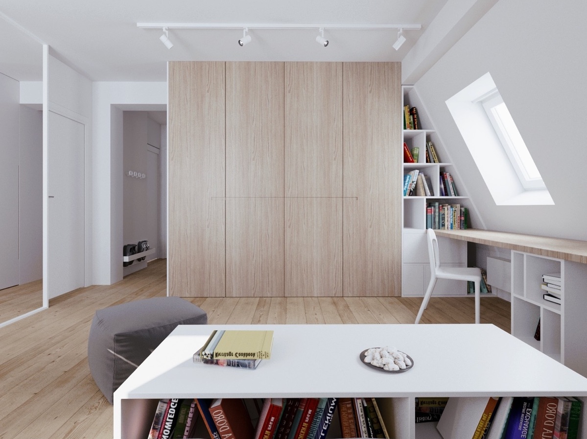 Un armadio che utilizza tutto lo spazio di una parete permette di avere più superficie disponibile per il letto in camera, una libreria che corre lungo la parete più bassa del soggiorno consente di usare quello spazio altrimenti poco vivibile, una cucina costruita seguendo le pareti permette di usare anche lo spazio sotto la finestra.