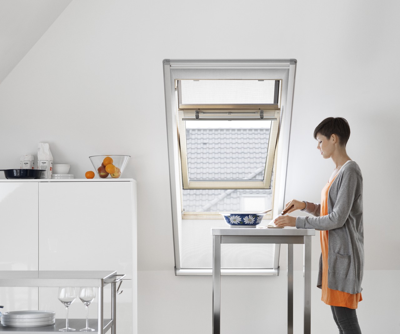 In estate l’effetto camino della finestra per tetti è importante soprattutto in cucina, dove è necessario un ricambio d’aria frequente, perché fa uscire l’aria umida e calda e fa entrare quella fresca e pulita. La zanzariera VELUX si può utilizzare anche a finestra aperta e permette di lasciare fuori tutti gli insetti molesti: la rete trasparente consente di far entrare la luce e l’aria e non ostacola la vista verso l’esterno.