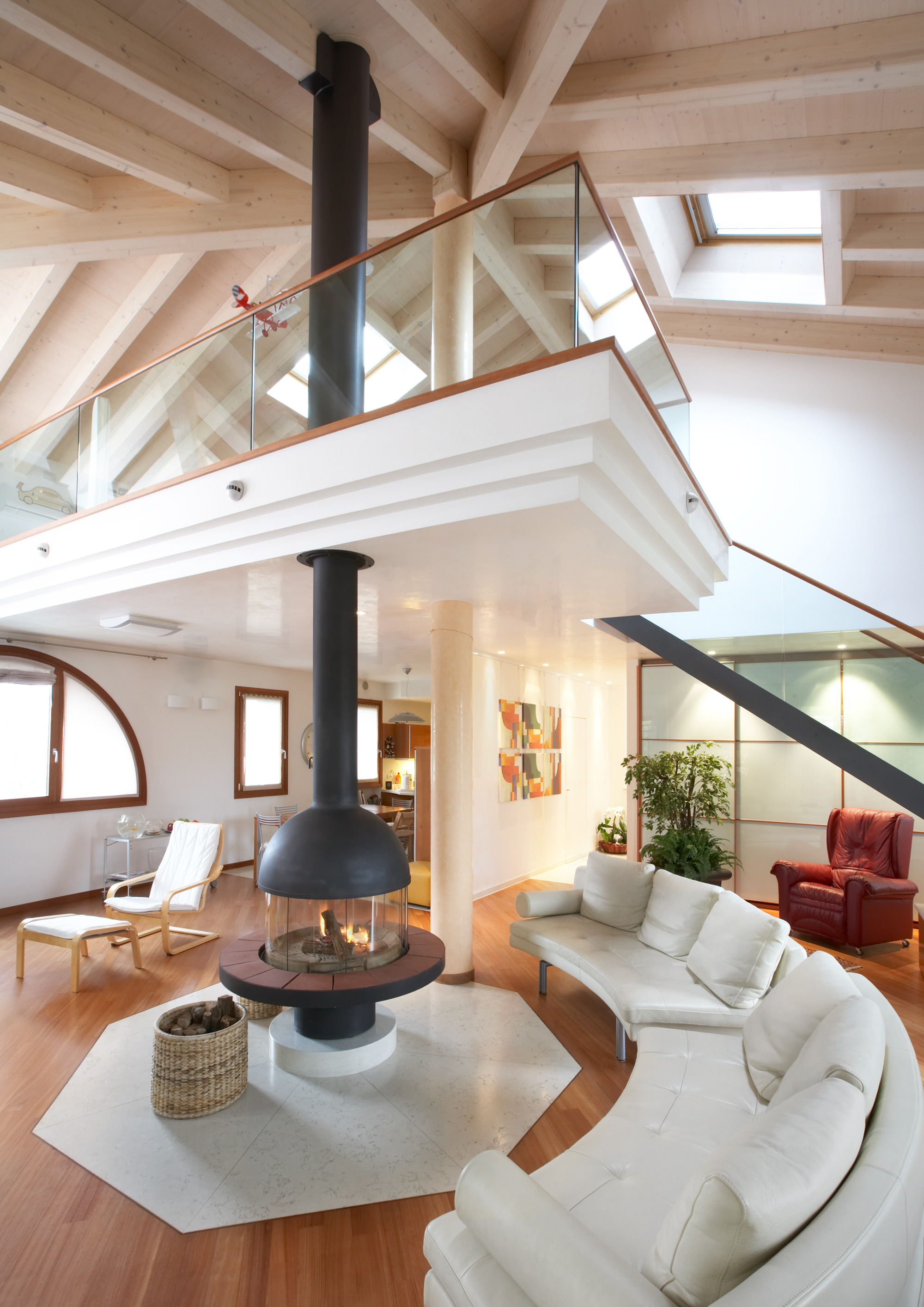 Posizionato al centro del soggiorno domina il caminetto di foggia nordica che riscalda l’ambiente creando uno spazio pensato per il relax e la conversazione.