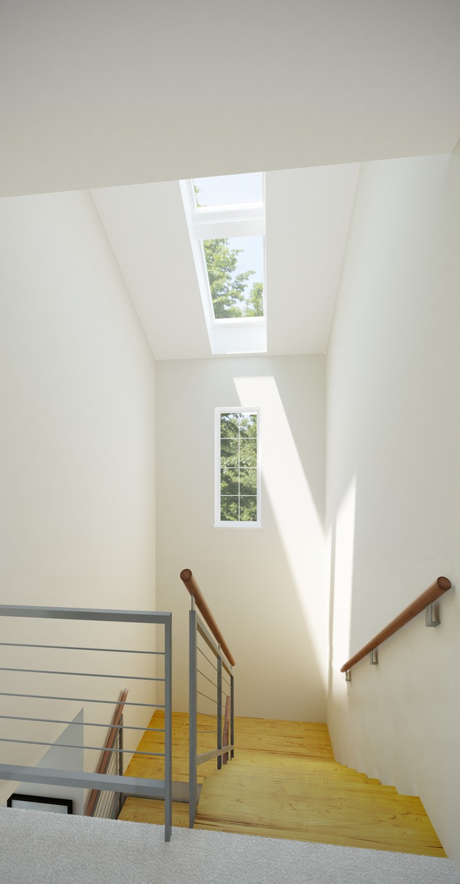 Una scala molto luminosa, grazie all’uso di una finestra per tetti oltre a quella sulla parete, porta al piano superiore dove sono situate le camere da letto.