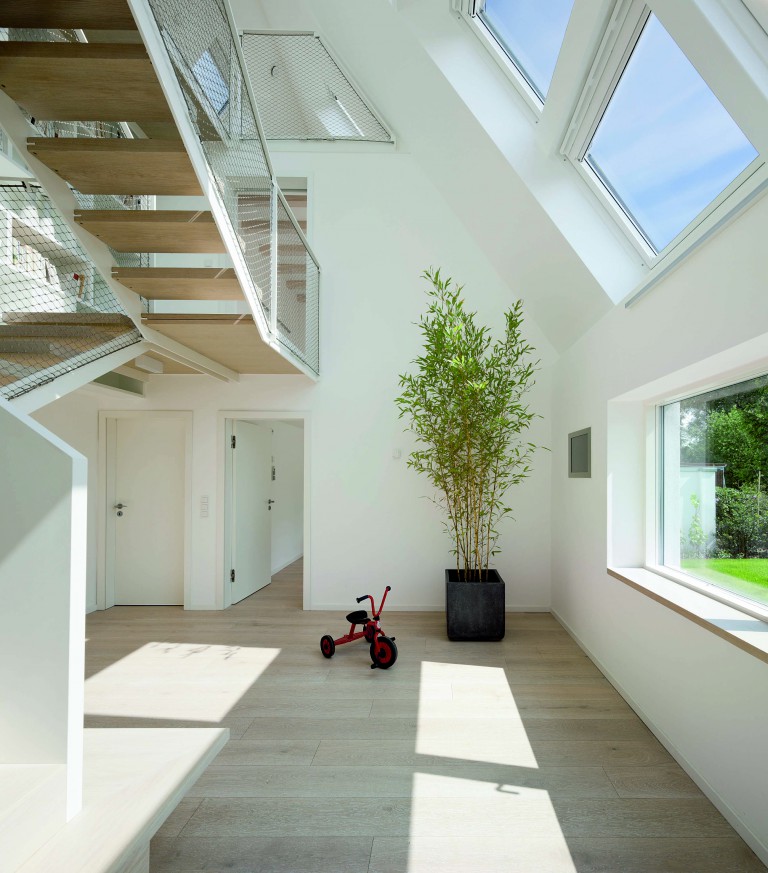 Tutte le stanze sono dotate di finestre in facciata o di finestre per tetti VELUX, posizionate in modo da garantire una distribuzione ottimale della luce naturale. Più luce naturale all’interno di una casa significa minori consumi di energia e ridotto bisogno di luce artificiale. La luce naturale non porta solo significativi risparmi sulla bolletta, ma anche benefici alla salute e al benessere degli abitanti. Per pianificare la distribuzione della luce naturale all’interno di LichAktive Haus e quindi la disposizione delle finestre, un team di esperti ha condotto delle analisi illuminotecniche che hanno permesso di misurare il livello di luce naturale all’interno degli ambienti. Normalmente, se il livello in valore percentuale supera il 4%, si ha un comfort luminoso ottimale. Nel caso di LichtAktiv Haus in alcune stanze si arriva fino al 10%.