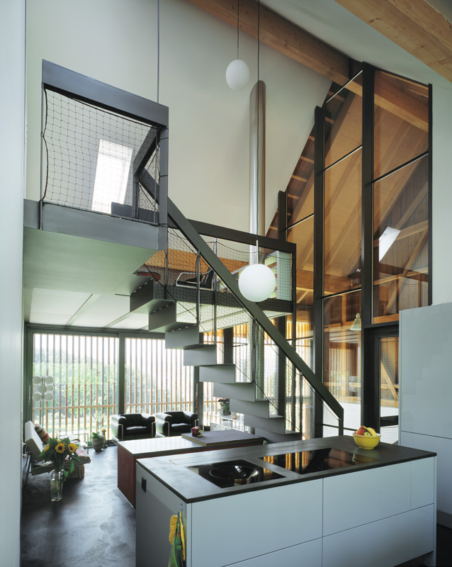 Per illuminare l’ex stalla, sono state inserite 5 finestre per tetti sovrapposte, a creare una striscia di luce, un taglio tra le due parti dell’edificio che illumina il living in tutta la sua altezza.
