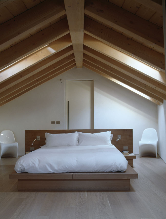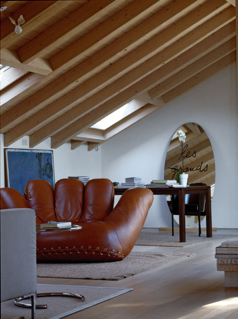 L’altro spazio living, al primo piano, è un ambiente a doppia altezza su cui si affaccia un ballatoio dove è inserita la libreria che si articola seguendo le pendenze del tetto. Interessante è l’effetto dell’illuminazione zenitale proiettata nel locale alla quota inferiore attraverso l’inserimento della finestra per tetti.