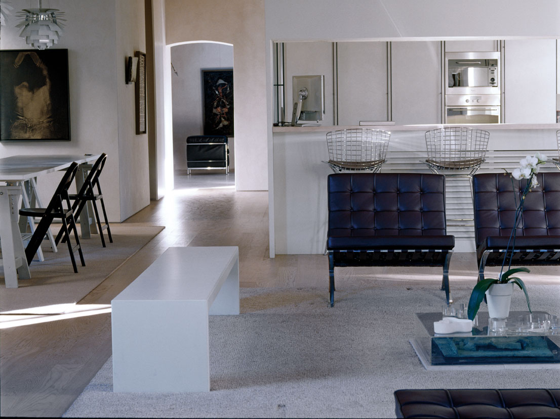 La doppia esposizione è stata sapientemente sfruttata sia per beneficiare della luce naturale per tutta la giornata, sia per valorizzare la visuale esterna sul fiume Lambro e sui tetti del centro di Monza. La struttura originaria è stata parzialmente recuperata; sono stati infatti mantenuti i muri perimetrali e quelli portanti. L’architetto ha privilegiato gli spazi aperti, alcuni delimitati da una semplice parete di vetro; per questo motivo anche la cucina si caratterizza come un cubo ricavato all’interno della zona giorno.